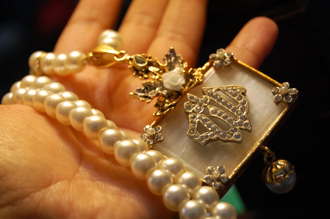 CALLIGRAPHIC PENDENT IN WHITE & PEARL STRING