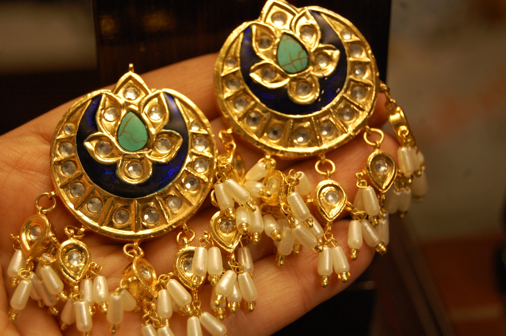 Traditional meena earrings with kundan & pearls